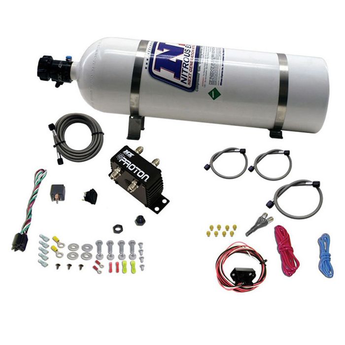Proton nitrous systems combine performance, durability and value in a compact and easy to mount, made in the USA, nitrous / fuel module. Proton systems now contain a new and improved nitrous / fuel module that is capable of producing up to 250 horsepower to the wheels! The new nitrous / fuel module is extremely durable and is compatible with progressive nitrous controllers. This Proton Plus system includes jetting for 35HP, 50HP, 75HP, 100HP, 125HP and 150HP but can flow up to 250HP with the optional SHO jet kit. This system includes a 15lb nitrous bottle with a high flow billet aluminum Lightning bottle valve, stainless bottle brackets, a single Shark nozzle, nozzle adapter, stainless braided nozzle lines, 15 foot braided stainless feed line, stainless fuel line, master arming switch, wide open throttle switch, 40 amp relay, relay harness as well as every nut, bolt and electrical connector needed to complete the installation. Fits all electronic fuel injected vehicles with a single throttle body. This system includes a TPS Autolearn wide open throttle module for use with all electronic fuel injected vehicles, including those with "fly by wire" electronic driven throttle bodies.