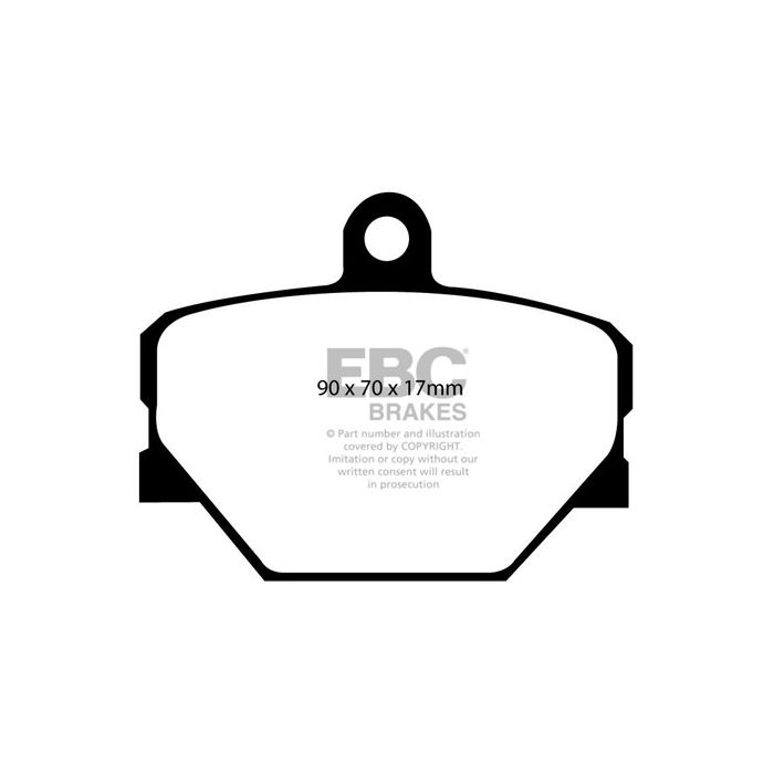 EBC YellowStuff brake pads new improved high friction aramid fibre compound, require no pre-heat and as the temperature rises their braking performance increases. These are the most popular pads in the EBC range for road use and occasional use on track and special stages on powerful tuned cars. Long life, minimised dusting, resistance to continuous aggressive braking are the main advantages of EBC YellowStuff.