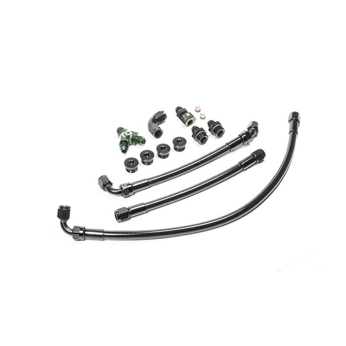 The fuel rail plumbing kits allow for an OEM bolt-on affair. The kits eliminate any unnecessary hoses that route over the top of the engine preheating the fuel. It plumbs the fuel rails starting from the SAE quick disconnect fitting upstream near the firewall. The rails are ran in parallel for even fuel distribution with a high flowing billet aluminum Y-adapter fitting. All hoses are high quality PTFE compatible will all fuel types including E85. Plugs are included for all unused ports.
