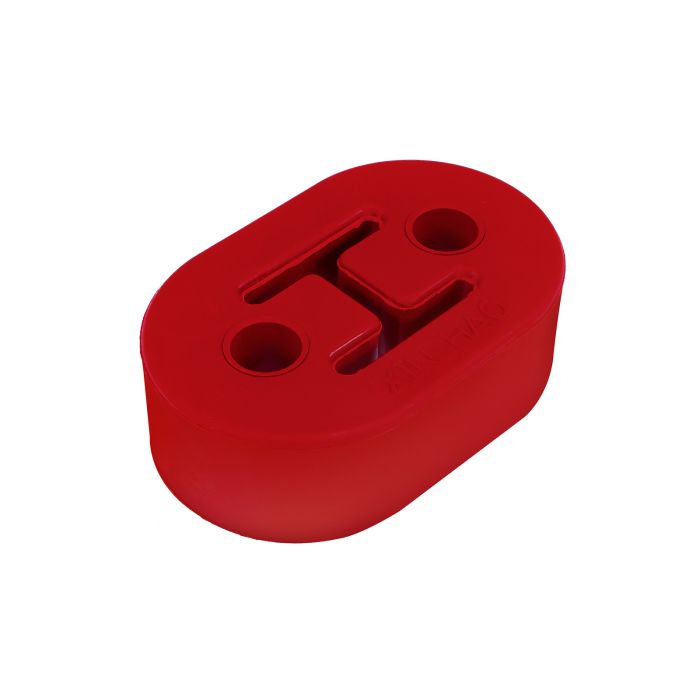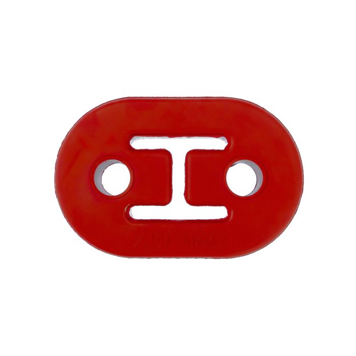 Universal-Gummi-Aufhängung, rot, mit 10-mm-Löchern. Hergestellt aus einem robusten Material, das aufgrund seiner hohen Elastizität viel widerstandsfähiger ist als Polyurethan-Äquivalente, und mit 2 Befestigungslöchern. Bestens geeignet für Sportauspuffanlagen.