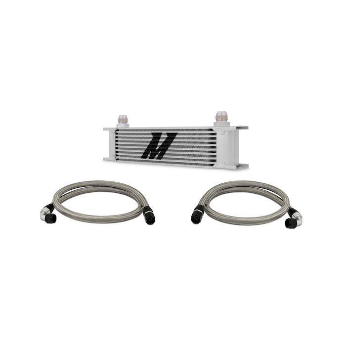 Proper oil temperature regulation is key to extending and preserving the life of your stock or high performance engine. Keep your temperatures in check with the Mishimoto universal oil cooler kit. This kit is applicable for most vehicles and includes all key components for reducing oil temperatures and providing your engine with extra protection against oil degradation. This kit includes a billet anodized aluminum sandwich plate in either standard or thermostatic form. The optional Mishimoto thermostatic sandwich plate provides additional temperature control and will limit oil flow to the cooler until optimal temperatures are reached, making it ideal for those in cooler climates. The included core is our proven Mishimoto 10 row stacked plate cooler which can withstand high fluid pressures and significantly reduce oil temperatures while exhibiting minimal pressure loss. This kit includes both a 3/4" -16 and M20-1.5 sandwich plate adapter which supports fitment for most makes and models. This kit also includes pre-assembled stainless steel braided oil lines with -10AN fittings and dowty seals for durable, leak free connections. Whether you are piloting a boosted rotary or blown small block the Mishimoto universal oil cooler kit will provide the efficiency you need to stay on the track and out of the shop. As with all our products this kit includes the Mishimoto Lifetime Warranty.10 row stacked plate cooler with universal fitmentCore: 12.91" x 2.81" / Thickness: 1.97" / Rows: 10Withstands high fluid pressures and reduces oil temperaturesIncludes both a 3/4" -16 and M20-1.5 sandwich plate adapterMishimoto Lifetime Warranty