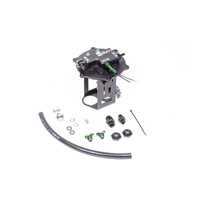 The machined assembly drops-in the factory fuel tank replacing the OEM hold-down flange. A single 8AN male pump feed port and 6AN male return port simplify aftermarket -AN hose plumbing. However the preassembled adapter fittings are compatible with the OEM fuel lines. This system is ONLY compatible with the following pumps: