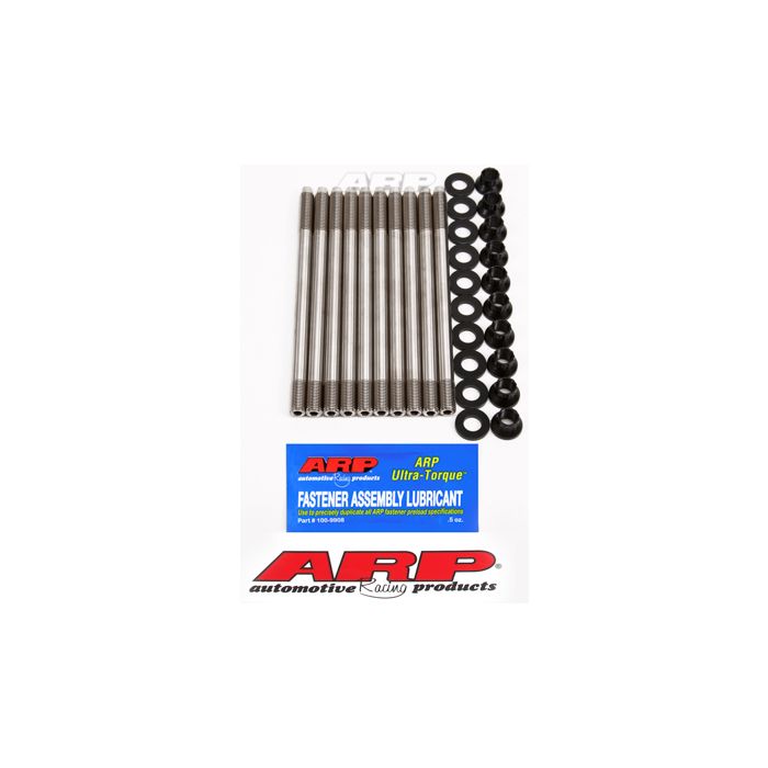 ARP's Custom Age 625 Plus material is newly formulated super-alloy demonstrates superior fatigue cycle life, tensile strength and toughness - with complete resistance to atmospheric corrosion and oxidation. ARP is the first to develop manufacturing and testing processes for fasteners with Custom Age 625+. Best of all, it is less expensive and expected to soon replace MP-35 as the material of choice in the high strength, super-alloy field. Typical tensile strength is 280,000 psi. Includes: (10) Custom Age 625+ studs (10) Parallel Ground Washers (10) 8740 Chrome Moly Steel 12 pt Nuts (1) 1/2 oz. Arp Ultra-Torque Assembly Lube