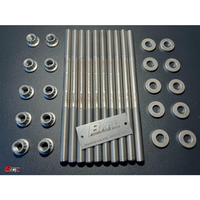 BARP is proud to offer and present to the international and national public, the line of the most resistant main and head stud in the world. Made of maraging 300, (currently the most tenacious metal  discovered and known) tested up to 10 BAR of turbo boost and up to 1500 HP per cylinder its used in tractor pulling engine and Top Fuel engine. They have strenght of over 220 kg/mm2 (335,000 PSI), 30% greater than the current reference material, the Custom Age 625. This type of studs bolt kit is the absolute top and is used on very high power engines, withstanding stresses beyond any limit in an excellent way. Using BARP studs realized in MARAGING 300, the possibility of any failure or movement of the tightened parts will be completely eliminated. They represent the obligatory choice for those who want to go beyond the limit and want to exclude the possibility of failure from this type of component.